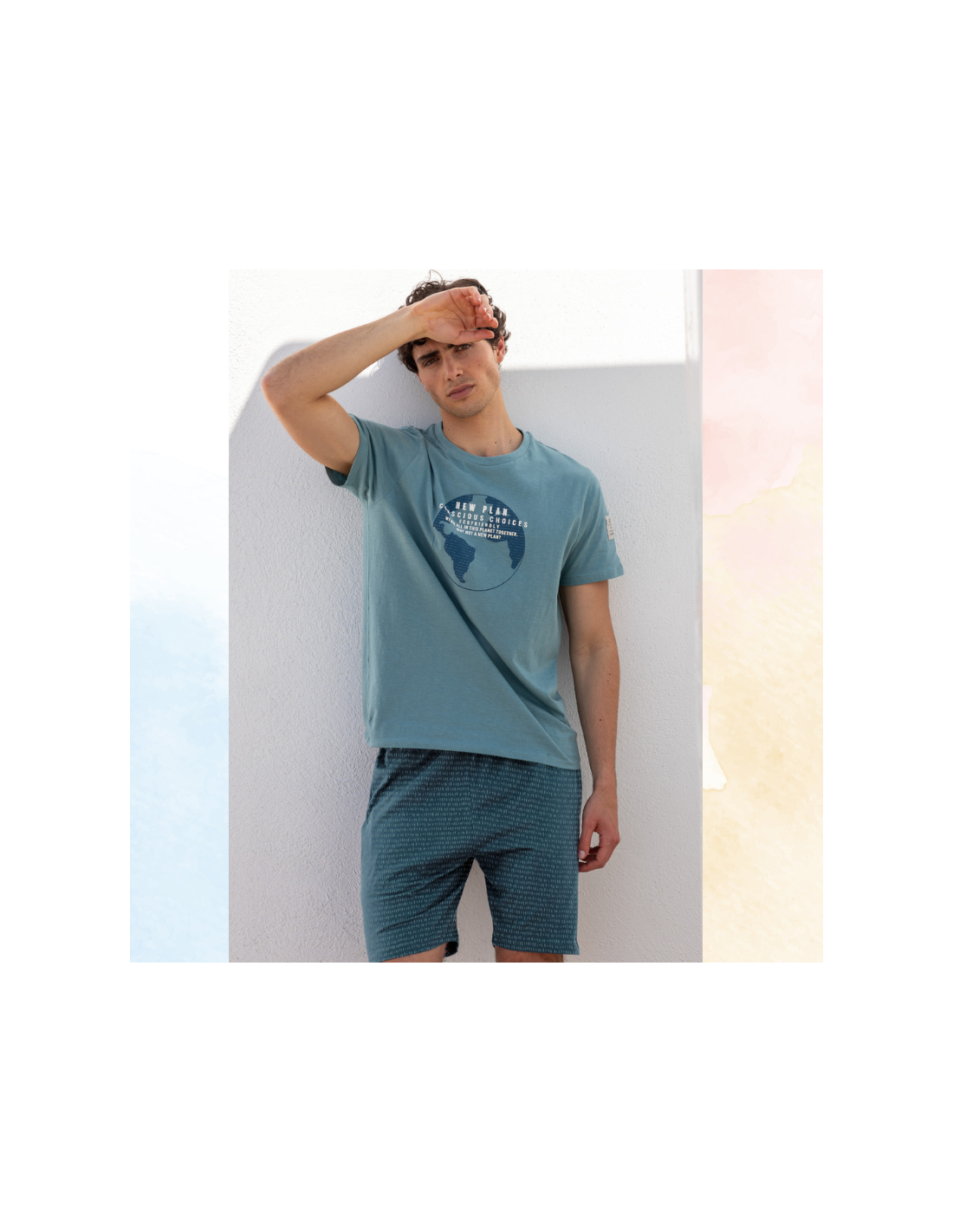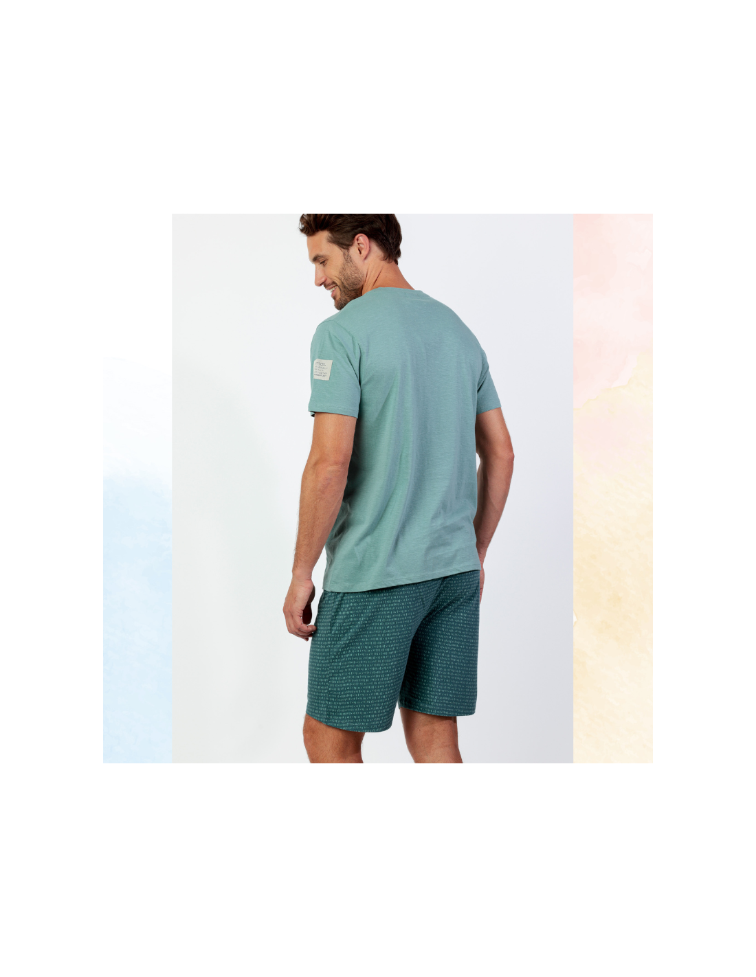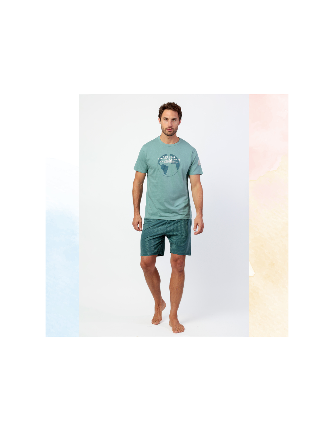 Pijama corto de hombre de verano. Camiseta de manga corta y cuello redondo en turquesa,