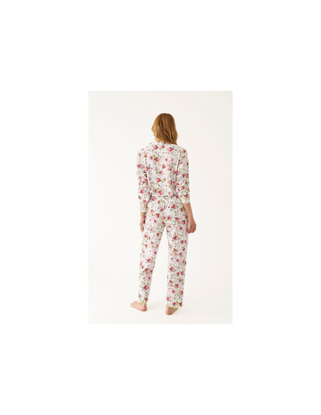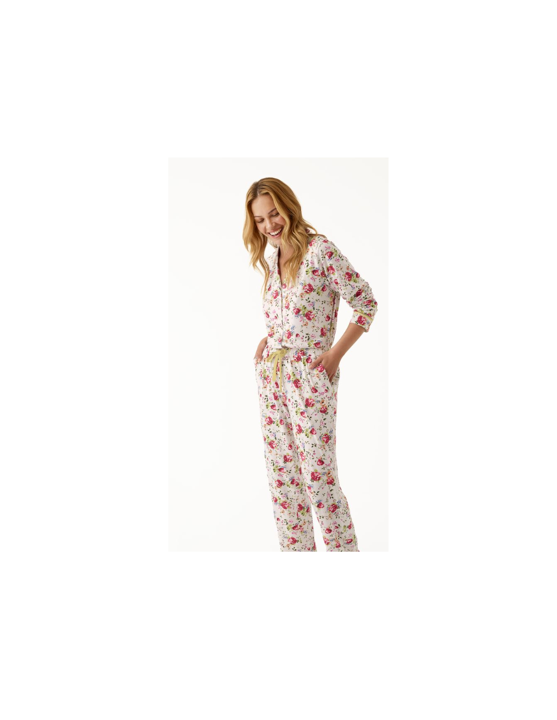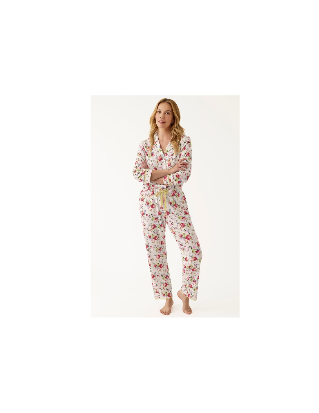 Elegante pijama de mujer largo  con estampado floral en tonos lila, rosa y verde.