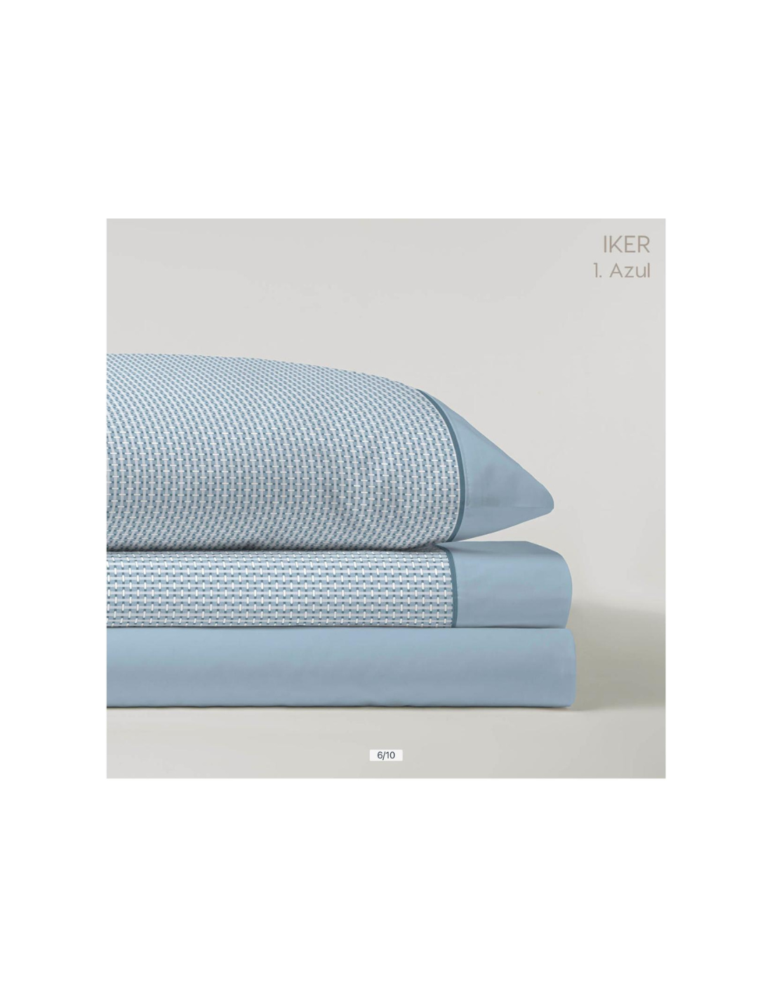 Juego de sábanas color azul. La bajera es lisa de color azul medio, con la encimera